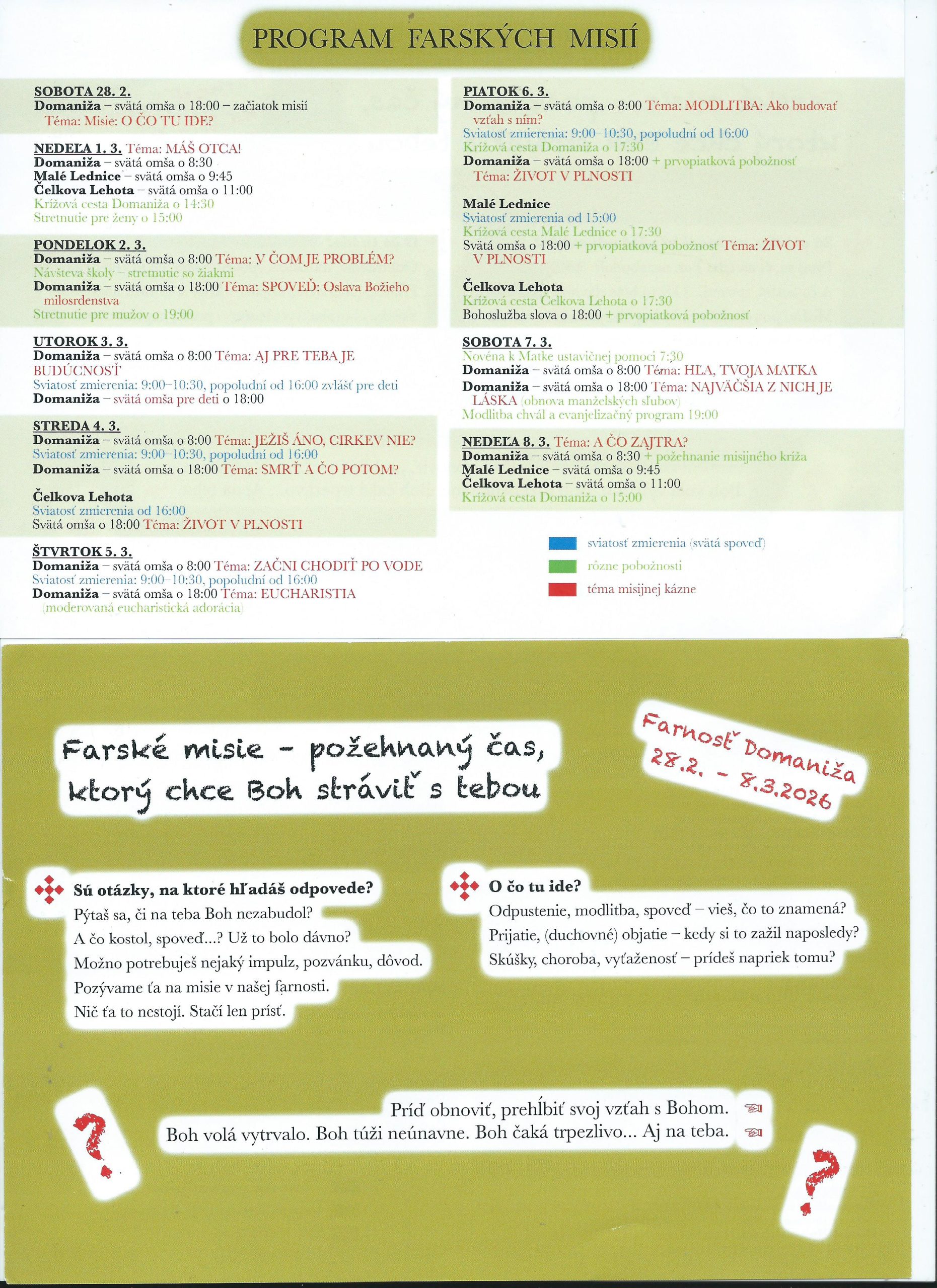 počas tohto týždňa až do nedele 8.3. prebiehajú v našej farnosti FARSKÉ MISIE. Duchovný program povedú pátri REDEMPTORISTI. Budeme môcť načerpať pri sv. omšiach, misijných kázňach, prednáškach či sv. spovedi… Srdečne Vás pozývame.